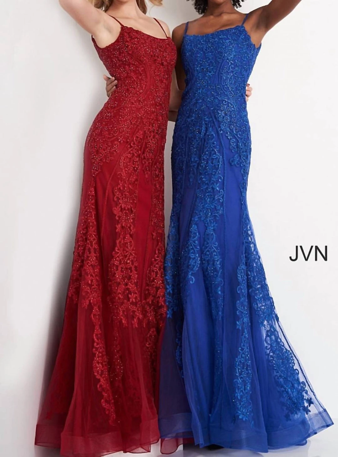 Details – Embroidered corset style prom dress, fitted silhouette, floor-length, sleeveless bodice with spaghetti strap neckline, tie back.
