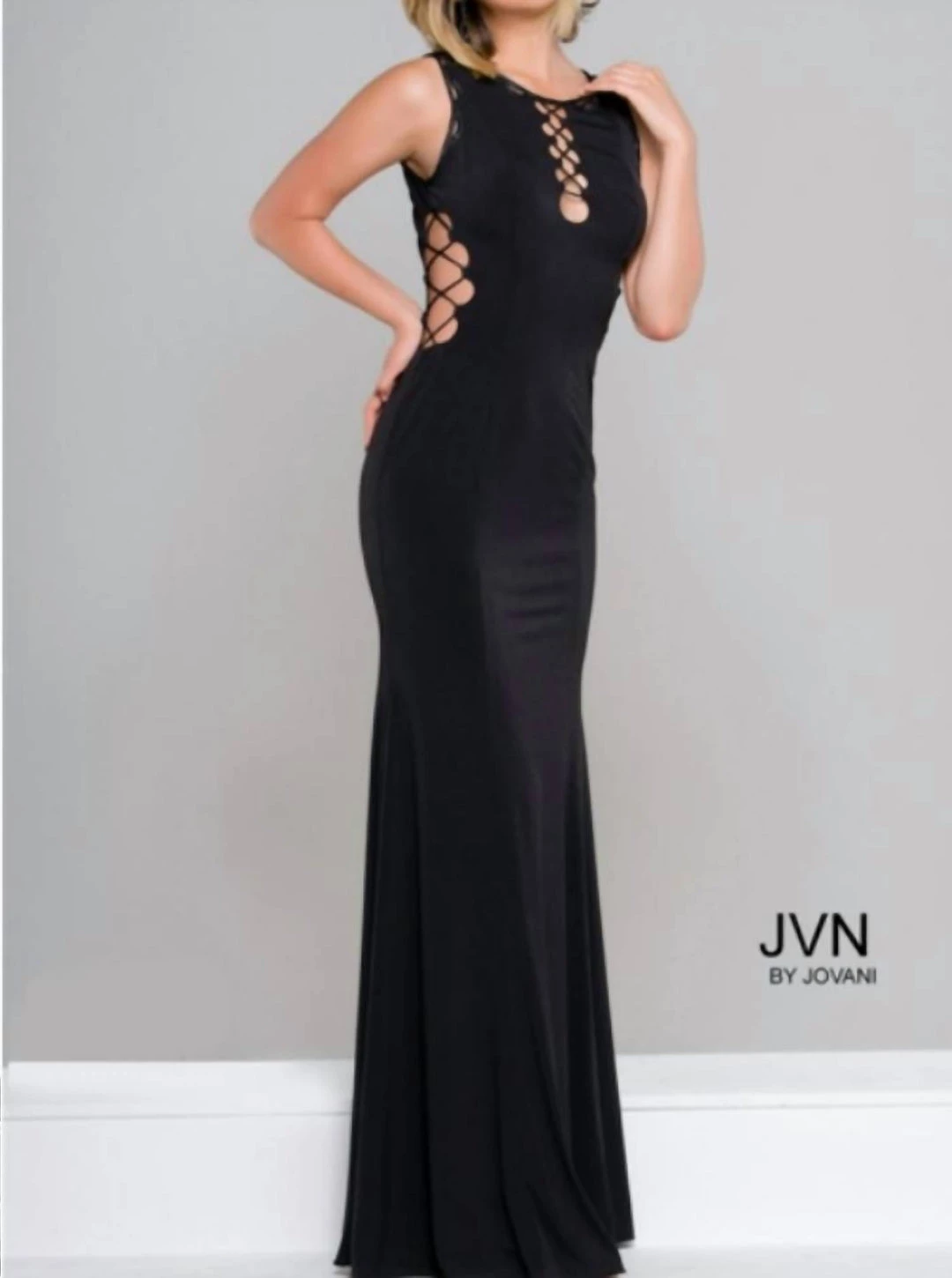 JVN by Jovani black sleeveless evening gown with lace up keyhole bust and lace up sides.