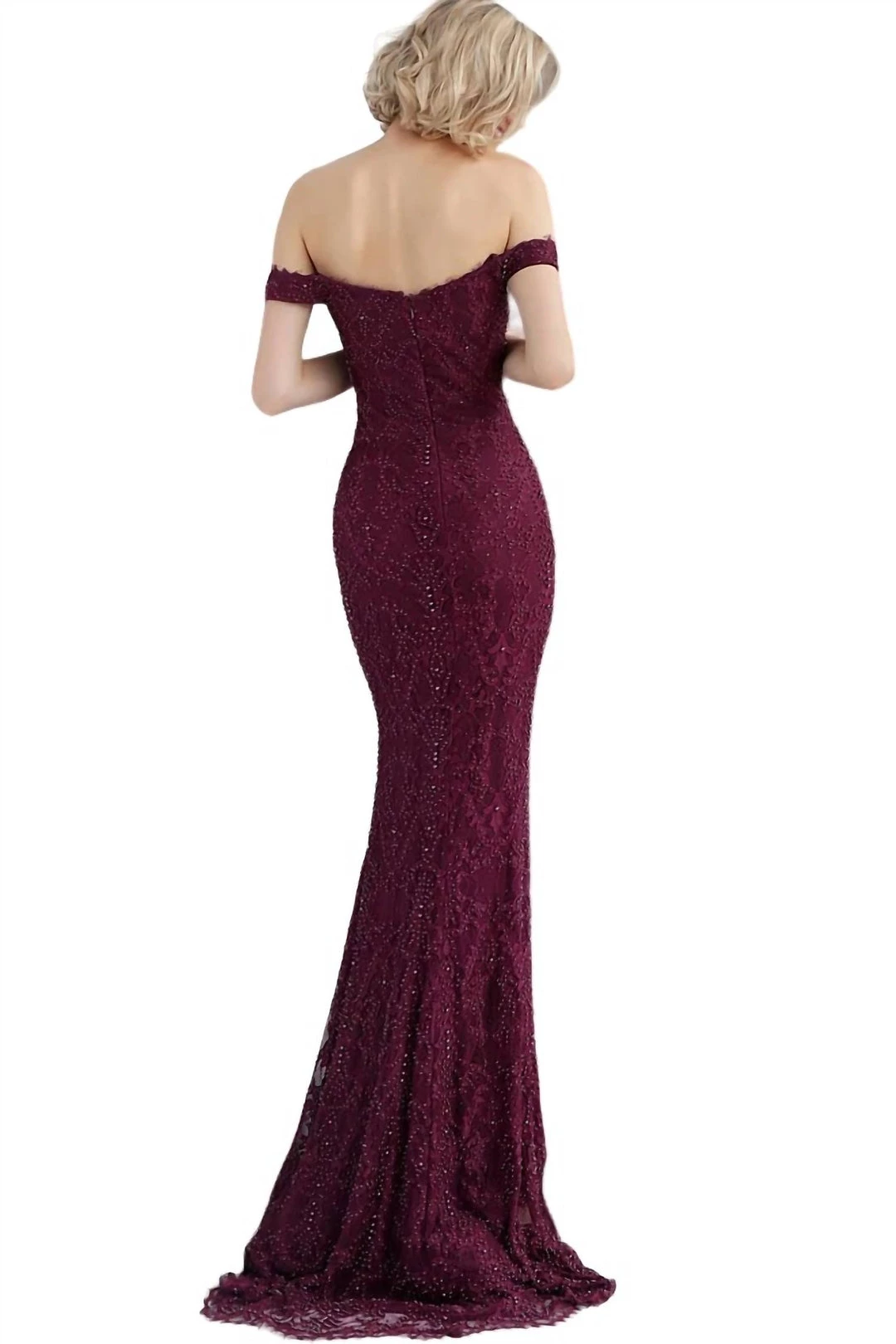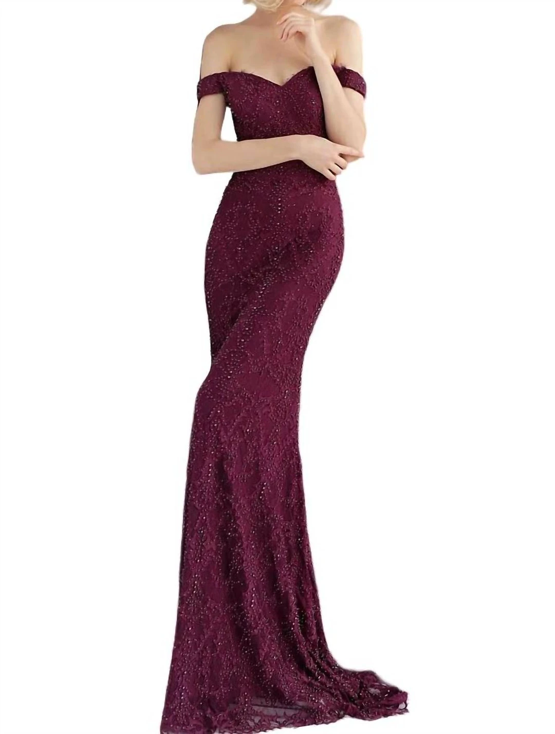 Beaded lace fitted prom dress with an off-the-shoulder bodice and sweetheart neckline and straight back, floor-length fitted skirt with a sheer sweeping train.