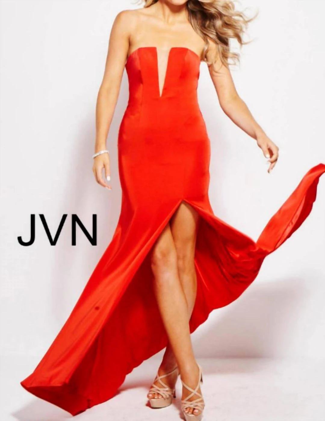 JVN by Jovani strapless evening gown with mesh insert and side slit.