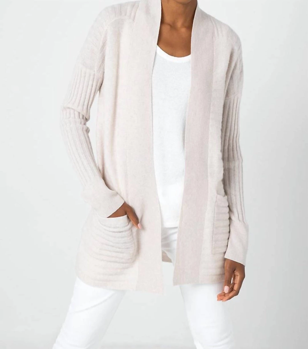Easy Rib Cashmere Cardigan in soft lightweight, pure cashmere, the perfect coverup when things cool down a little. With ribbed sleeves and shoulders, two pockets. Open front. Imported.Cashmere ๏ฟฝ๏ฟฝ๏ฟฝ 2ply/9gg