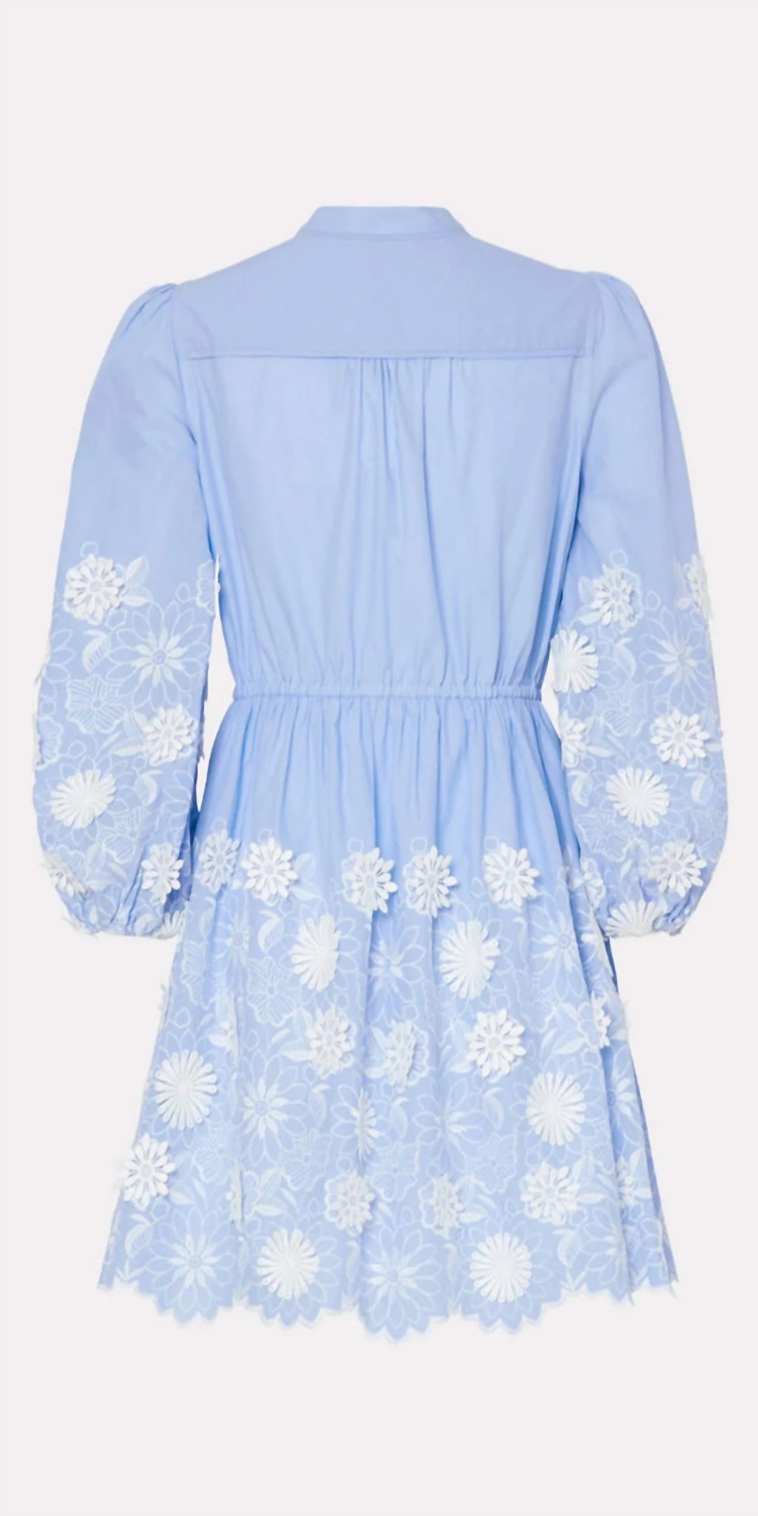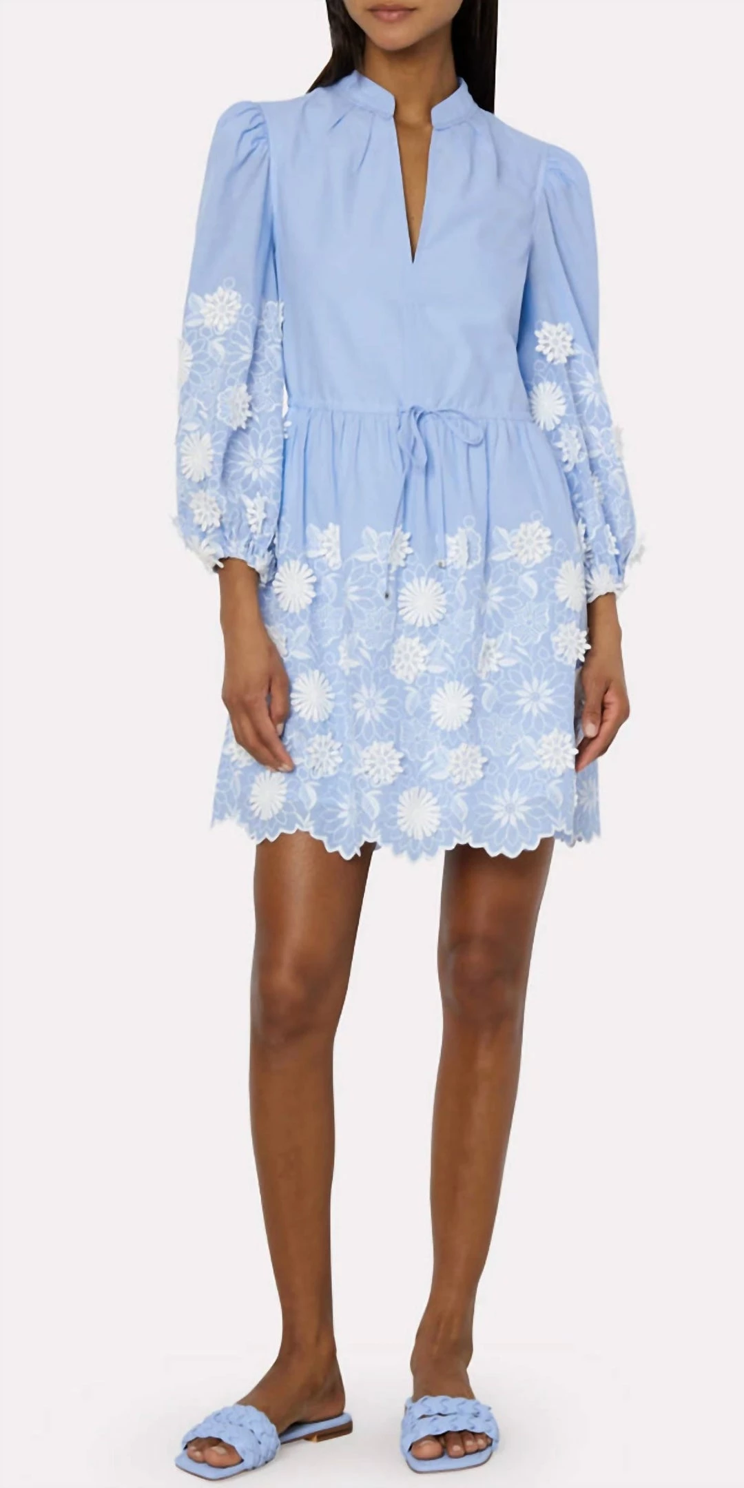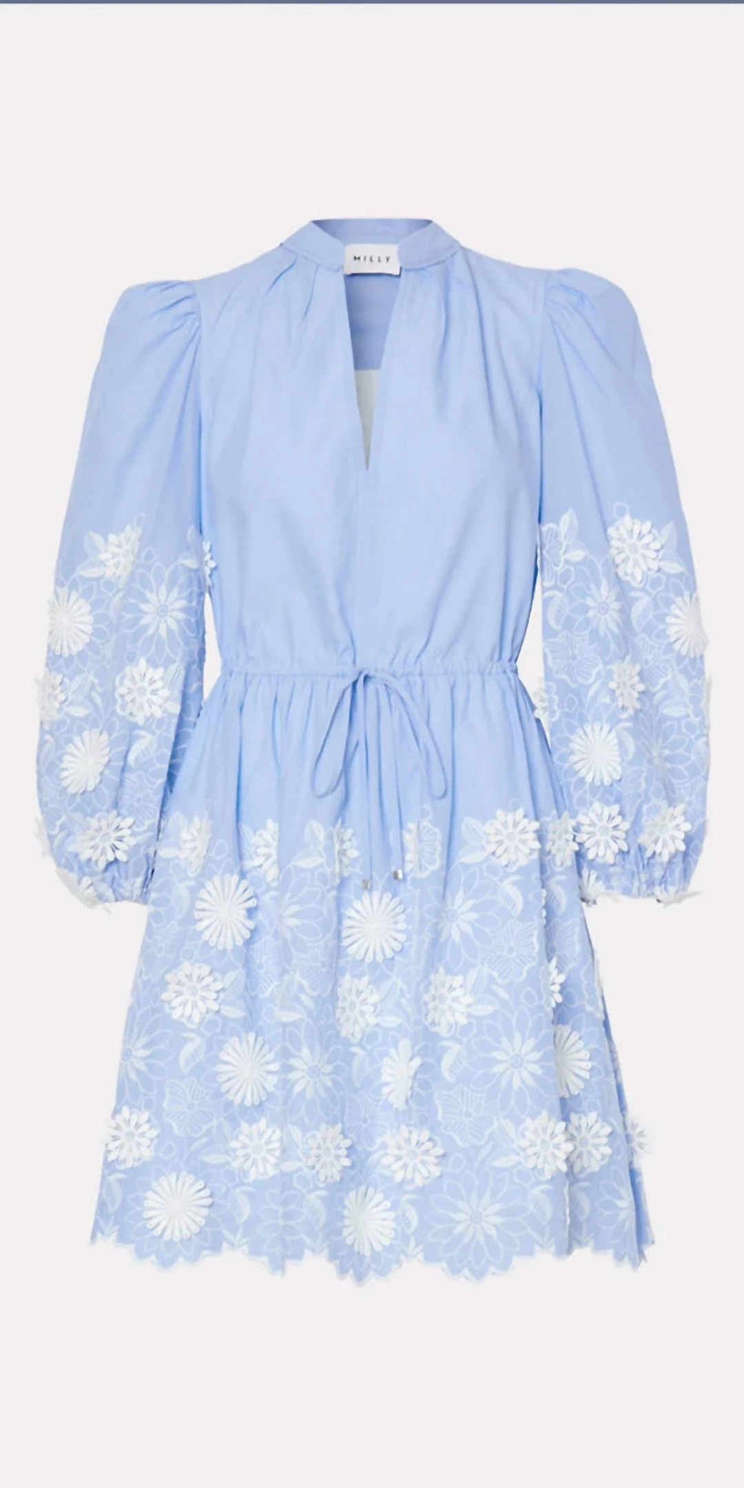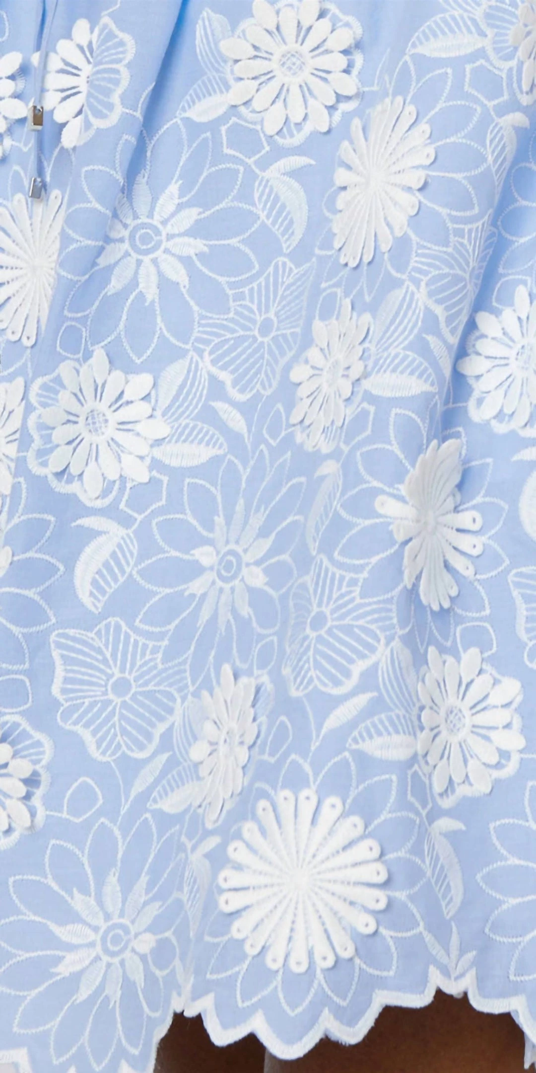 This dress has a mandarin collar that opens to a v-neckline. Peasant sleeves create volume that is offset by a cinched in drawstring waist. The hemline and sleeves are decorated with 3D embroidered flowers. It comes in white over blue chambray or white on white���both options are vacation-ready.Mini DressLong SleevesV-NeckDrawstring waistPullover3D flower decorations