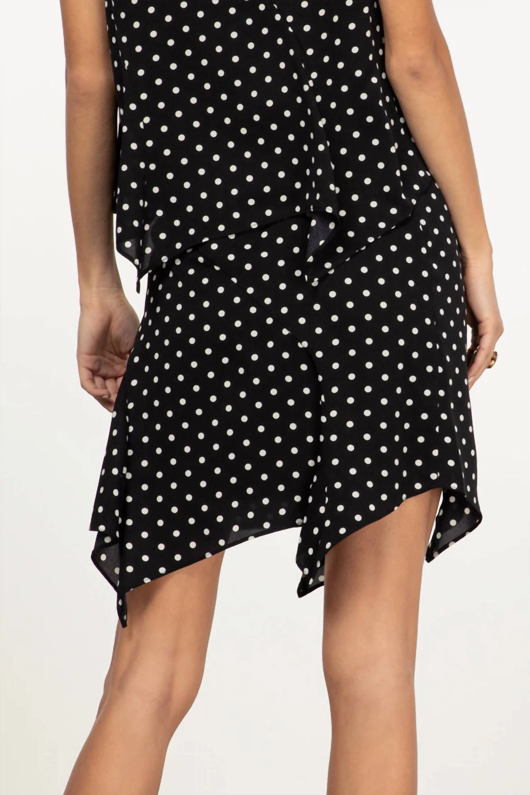 Mini skirt in black/white polka dot printAsymmetrical hemSide zipperDry clean onlyModel is 5’11”, wearing 2