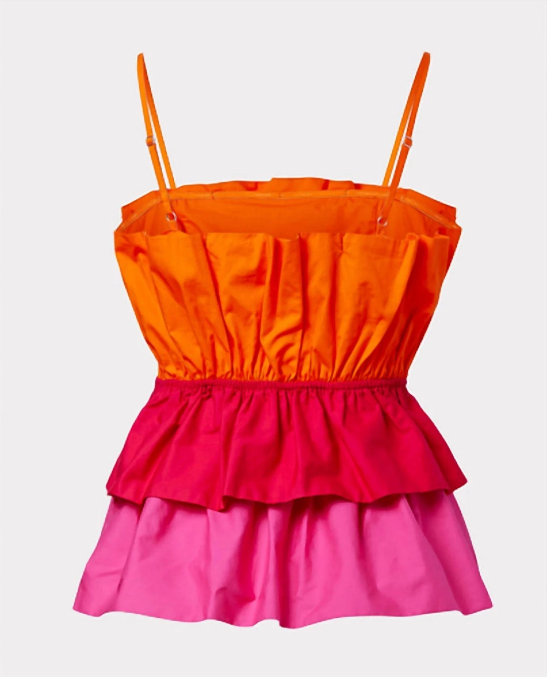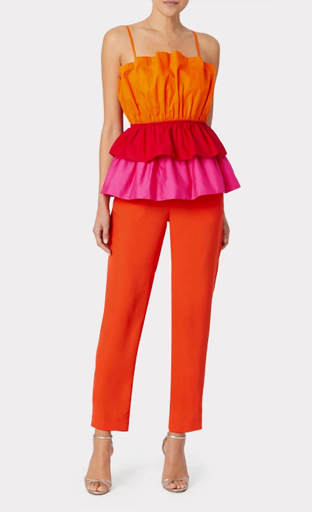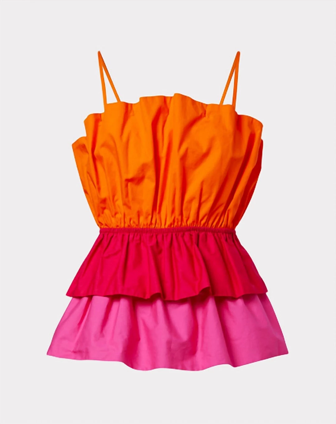 Red, Pomegranate and Coral are featured on this three-tiered ruffle poplin shirt. Pair with denim or a vibrant skirt in summer.