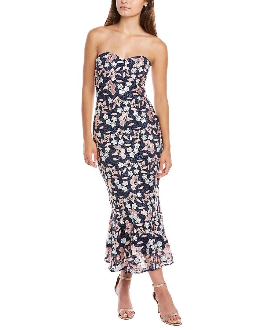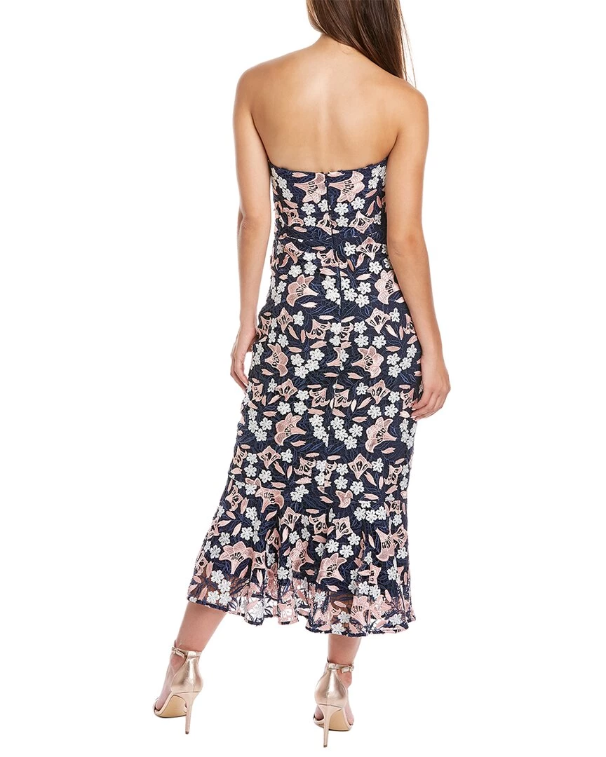 - Asher Midi Dress In Navy And Blush With Floral Lace Design And Ruffle Hem