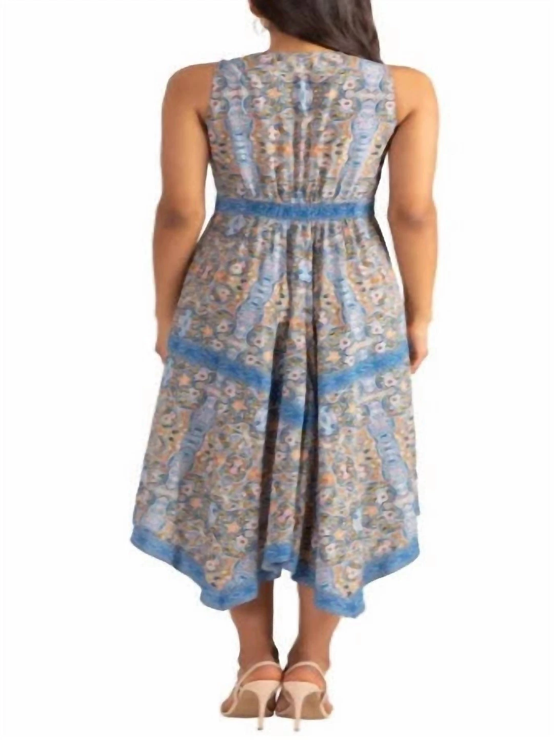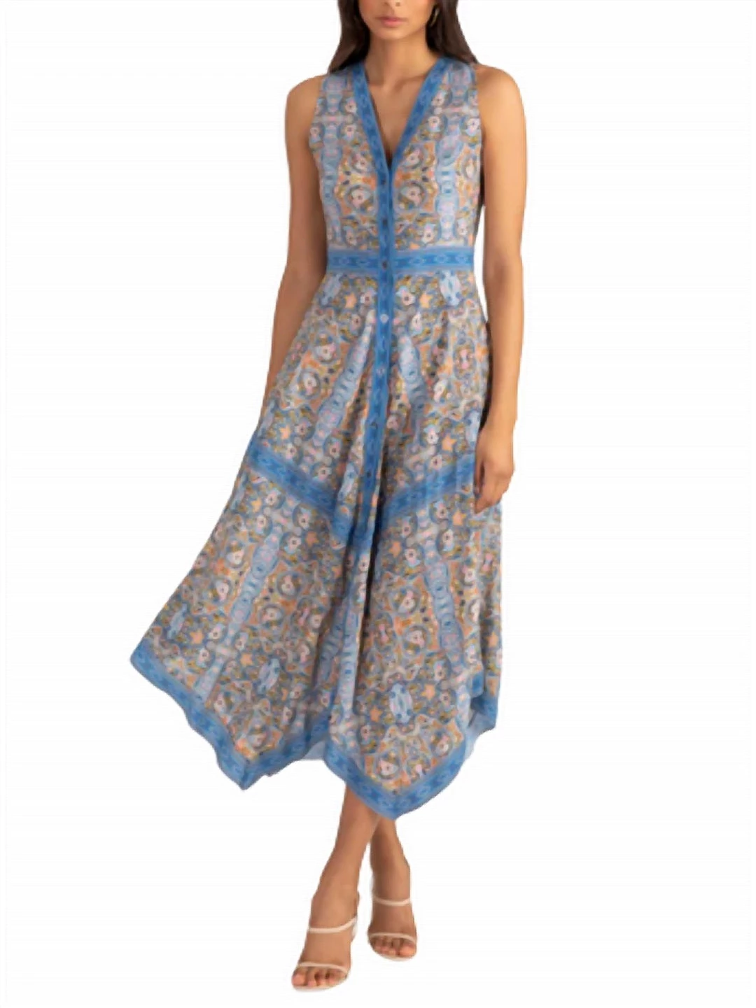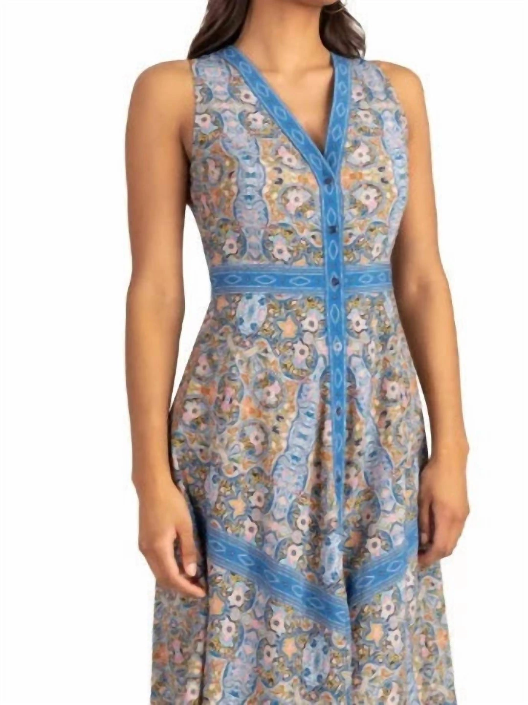 Gorgeous printed sleeveless button-down midi dress. Style features a v-neckline with contrasting placed border along the center front placket, waist, skirt and the handkerchief hem.ΓΒ Unlined. Button down front.55% Viscose 45% RayonDry clean only.ΓΒ