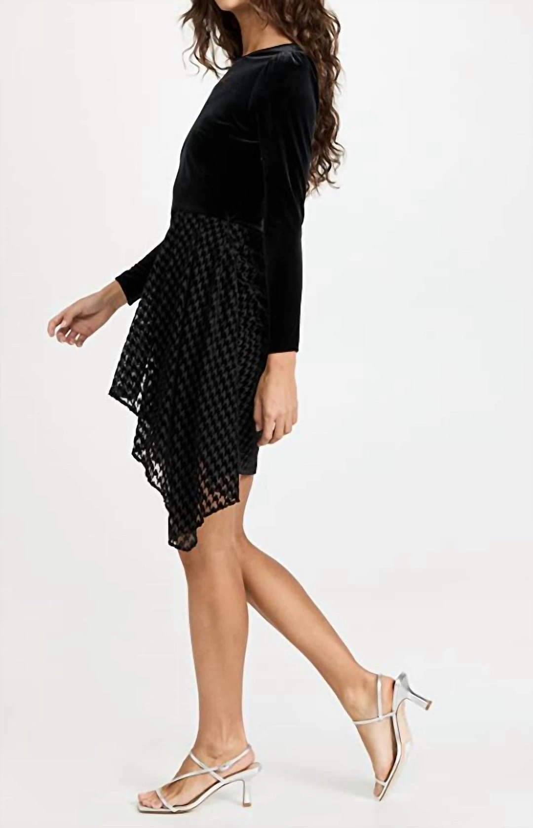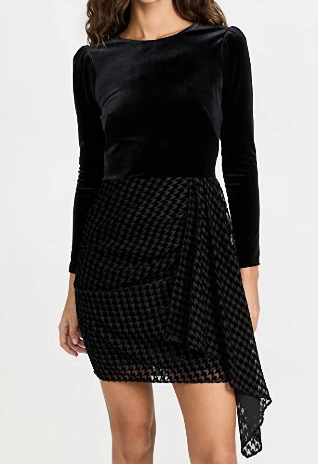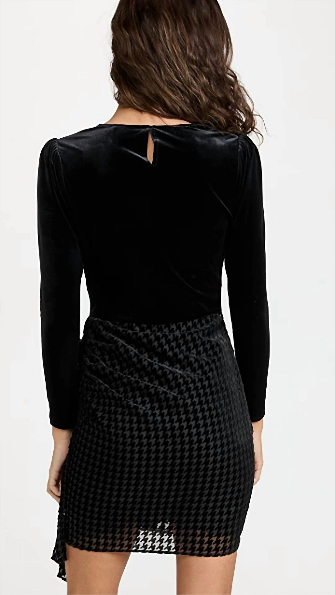 Mid-weight stretch velvet / flocked weaveRound necklinePleated puff shoulders and long sleevesDraped detail at waistTonal houndstooth patternHook-and-eye keyhole at backDry clean